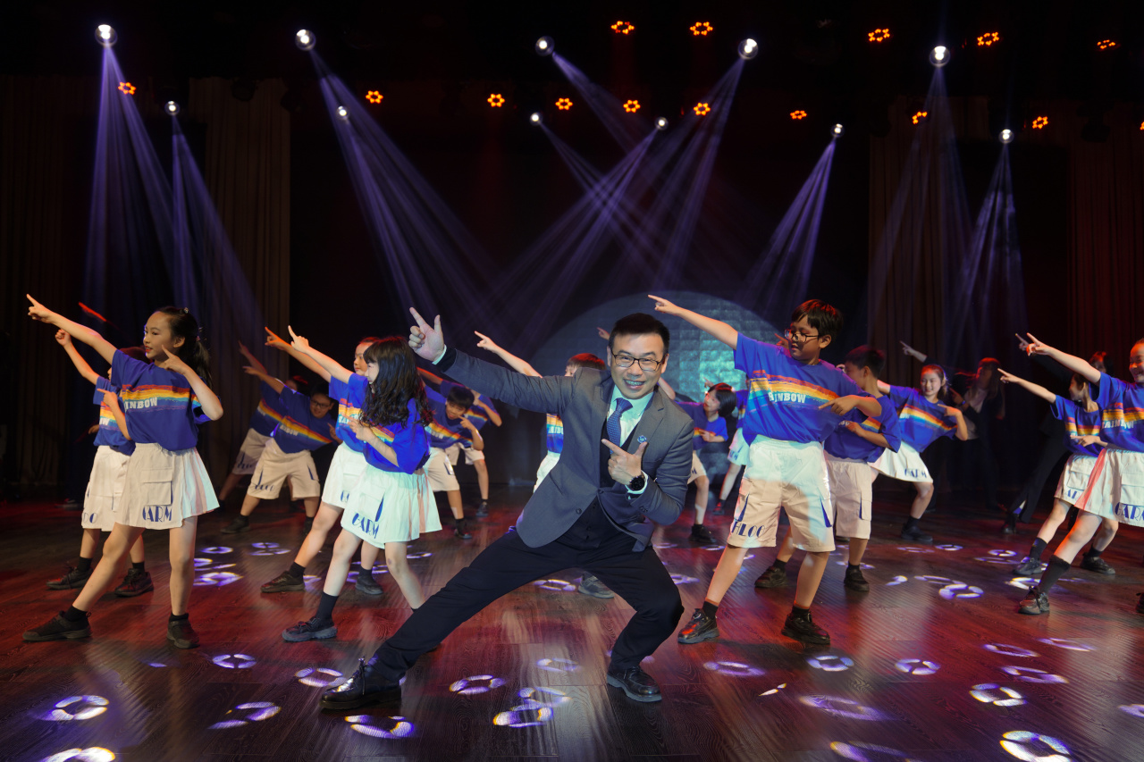 意外惊喜!园外总校长潘鑫先生走上舞台,和同学们一起欢乐起舞,将全场气氛推向高潮!