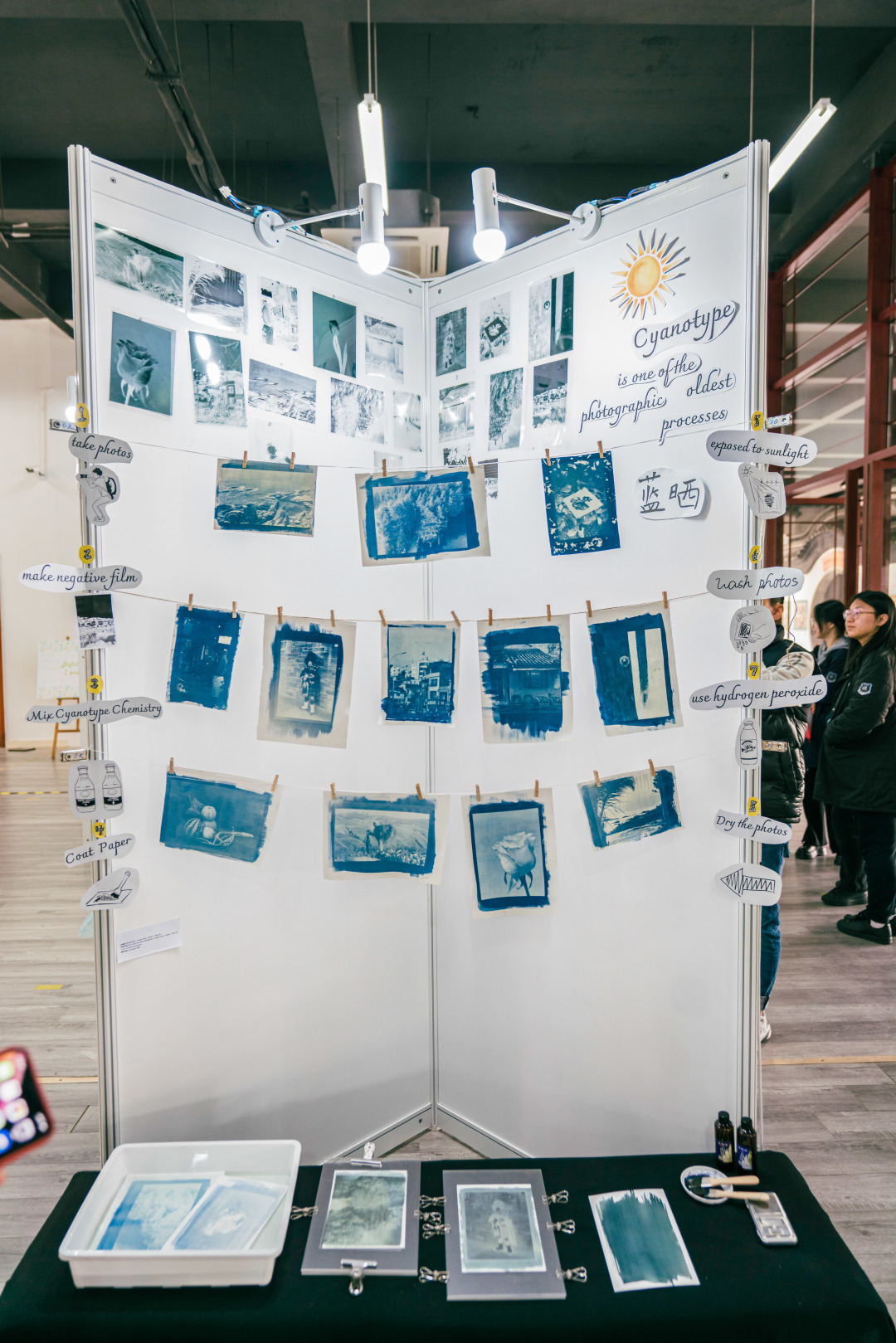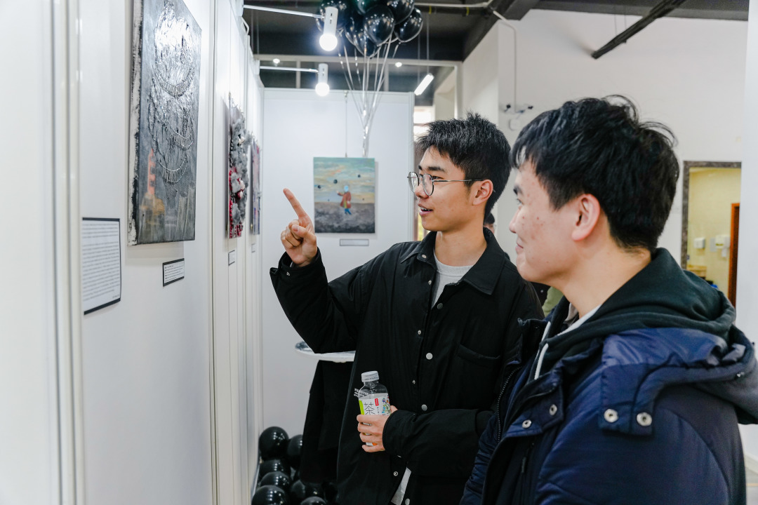展览前一天,老师们和学生们挑灯夜战,紧锣密鼓地布置展区。每个展区和作品的布局都由学生们亲自规划和设计,他们希望可以通过区分不同的艺术主题来引导观众欣赏作品。在此次展览中,大家将看到形式多变、富有创意的艺术作品,如油画、装置艺术、板绘、动画和版画等等。