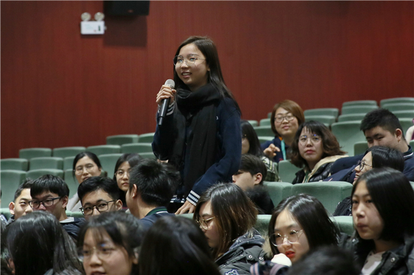 The whole speech involved two sessions. In the first half, Dr. Zhang shared her personal study and work experience with students to explain why studying in the U.S. and the key advantages about American universities. She clarified the educational philosophy of “learning for real-world application” by citing the examples of Bill Gates and Zuckerberg. Compared to academic performance, US universities are more likely to think highly of and highlight the skills of knowledge application, creativity and practices. In the light of this, Dr. Zhang expressed that our students have already been endowed with an excellent platform where they could enhance the basis through more attention and more participation.